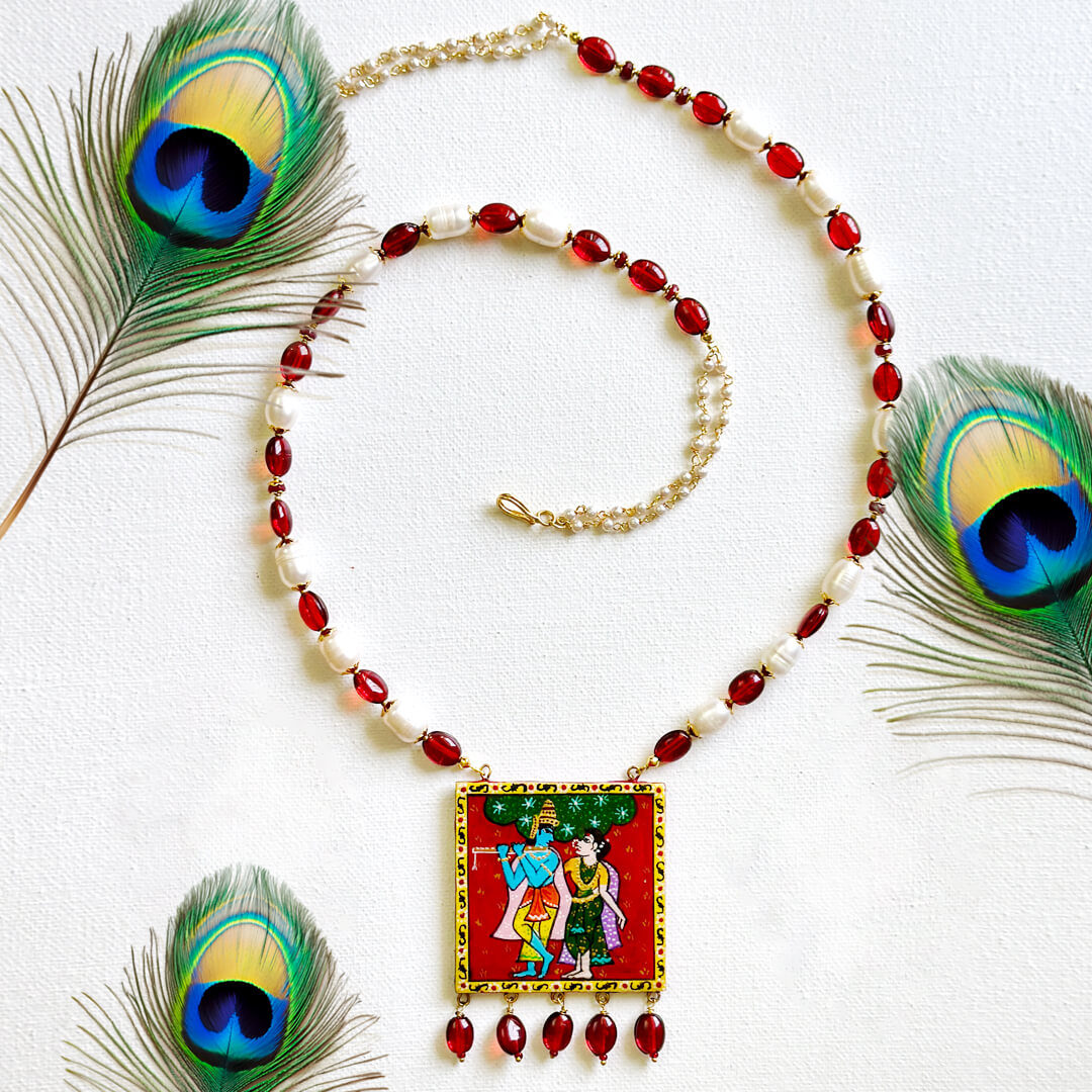 Handcrafted with intricate Cheriyal Painting, this exquisite set features a hand-painted Radha-Krishna pendant. Strung with real pearls and glass beads, it blends tradition with elegance perfect for collectors of heritage jewellery. A timeless treasure of Indian artistry!