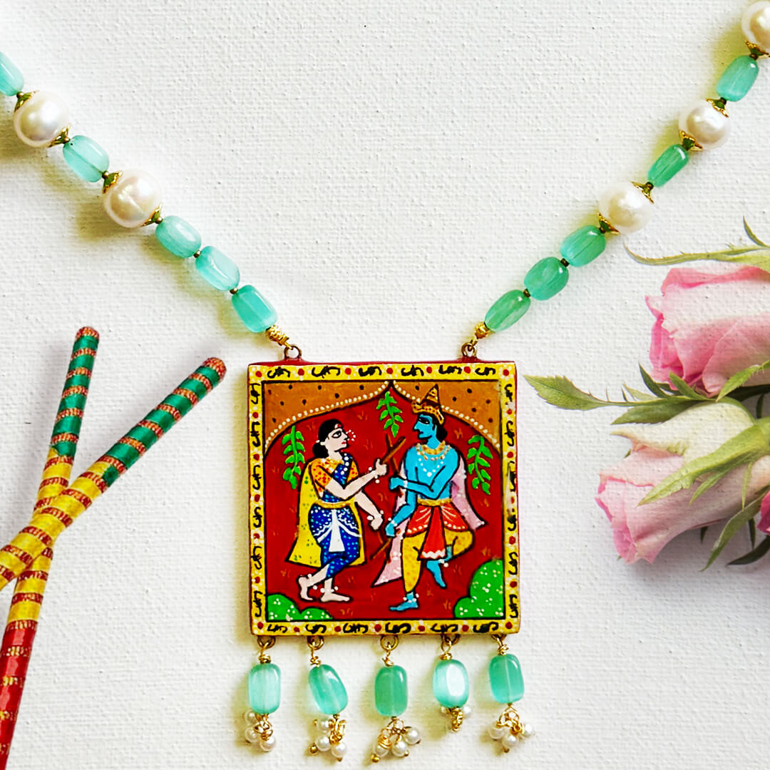 This handcrafted necklace features a Cheriyal Painting pendant, intricately painted to depict a traditional Indian folklore scene filled with cultural richness. Strung with real pearls and natural jade beads, its regal hues and gold-tone details create a statement of elegance and heritage. An everlasting masterpiece of craftsmanship!