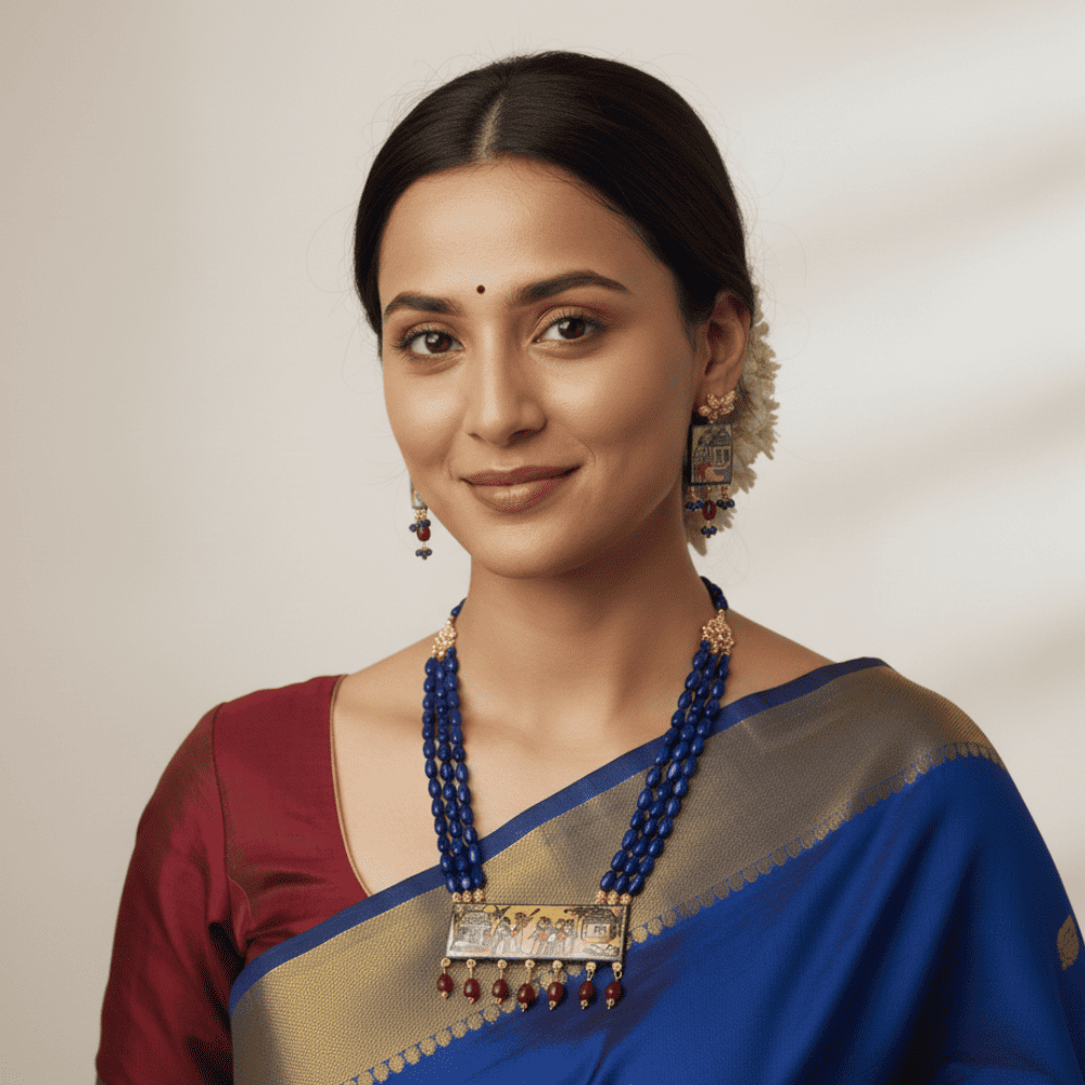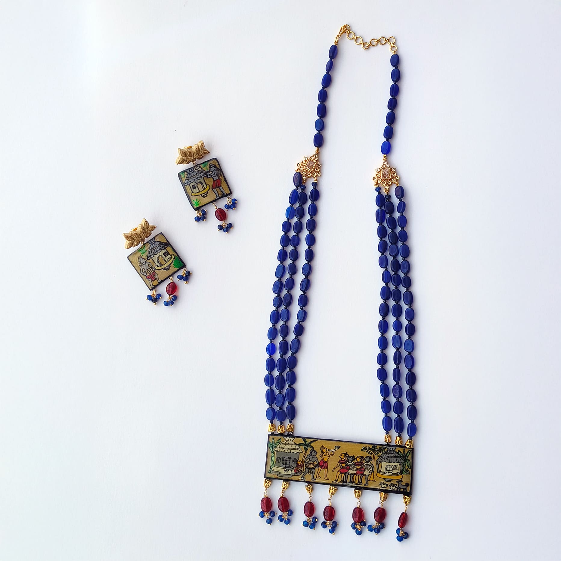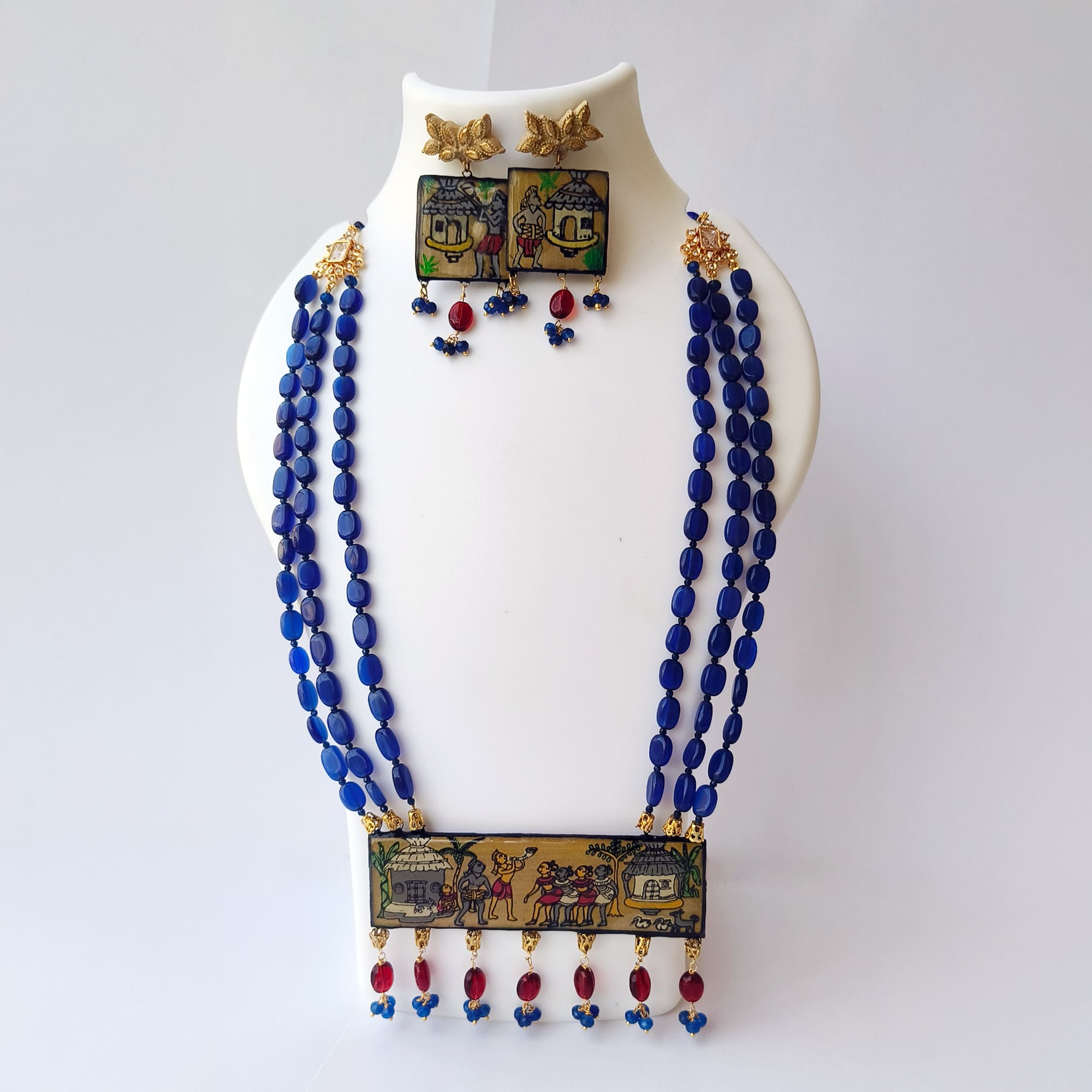 A beautifully crafted necklace set featuring a palm-leaf hand-painted pendant, triple-strand blue monalisa beads, and coordinated earrings. Designed with gold-tone connectors and red bead accents, this set brings a touch of folk art elegance to any ethnic look.
