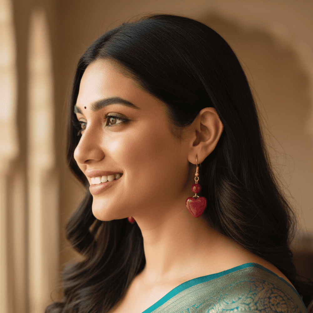 Scarlet Drops are handcrafted earrings featuring a romantic maroon heart with a matching bead. Accented by a golden hook, these earrings strike the perfect balance between cute and classy. Lightweight and expressive, they’re ideal for gifting or adding a soft romantic touch to your look.