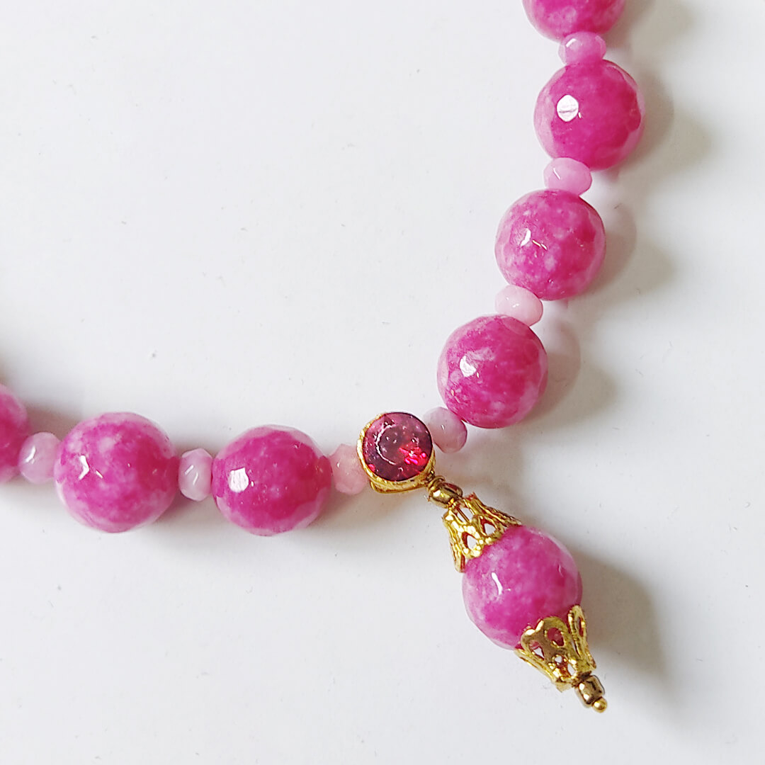 The necklace features a series of glossy pink polymer clay beads, molded and polished to resemble semi-precious stones. The centerpiece pendant is finished with a golden-toned accent, adding just the right amount of shine. The soft, stretchable elastic thread ensures a flexible fit — easy to wear and remove without clasps or metal irritation.