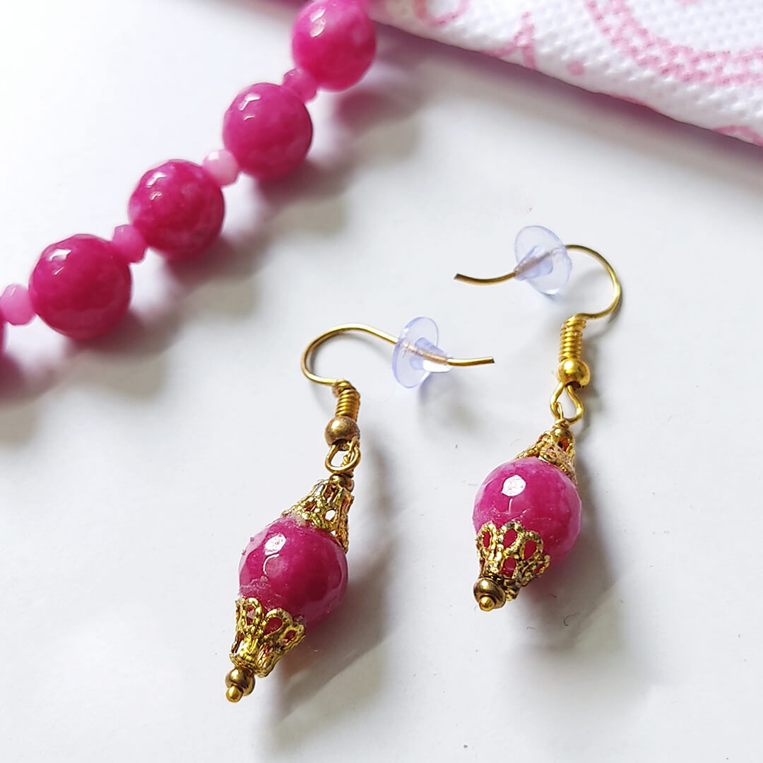 Accompanying the necklace is a pair of drop earrings, crafted with the same pink clay beads and golden bead caps. Each piece is lightweight, hypoallergenic, and designed with children’s comfort in mind.