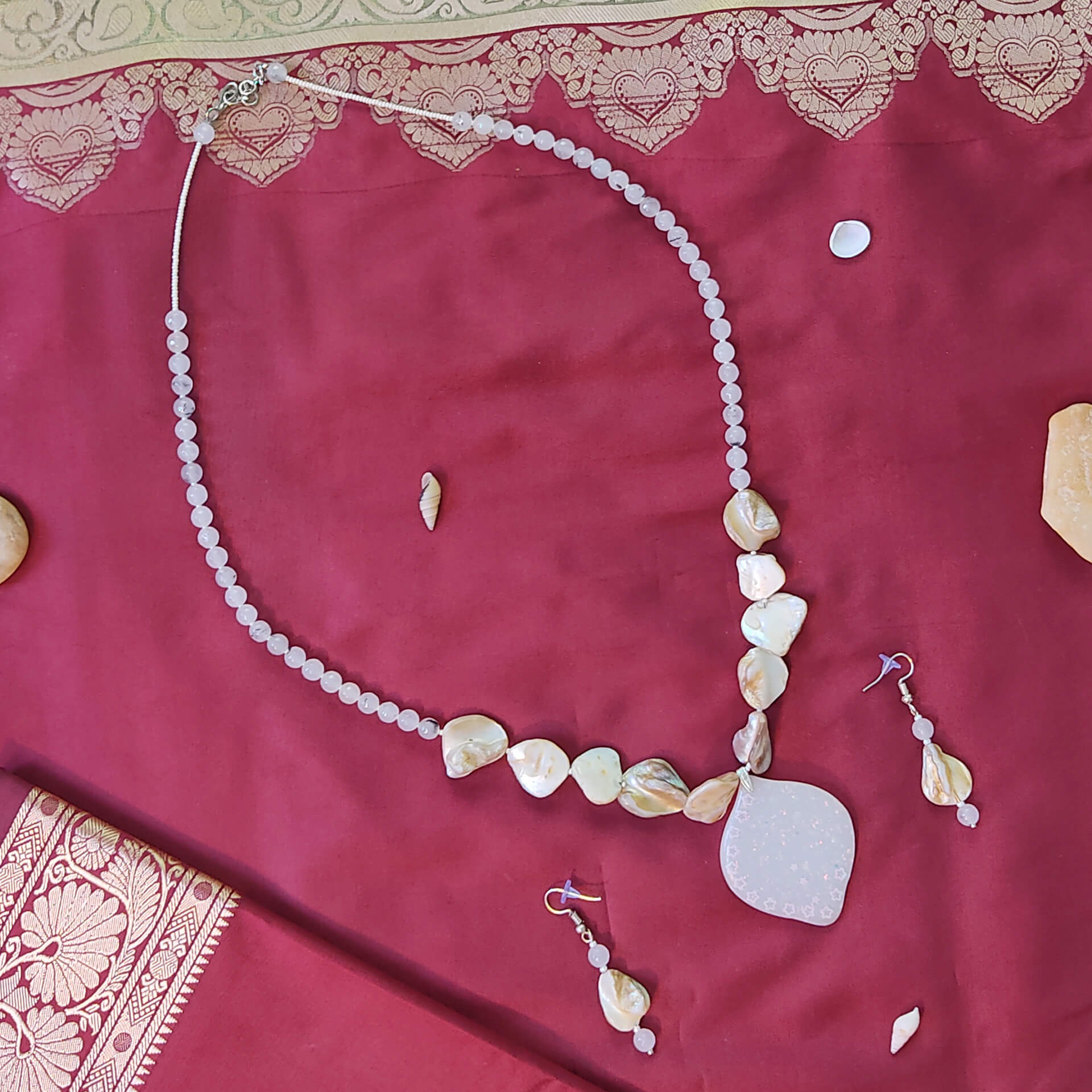 Elevate your look with our Shells & Stones necklace set, handcrafted with a dreamy resin pendant and an elegant chain of shimmering mother of pearl. A unique piece that blends sophistication with natural charm.